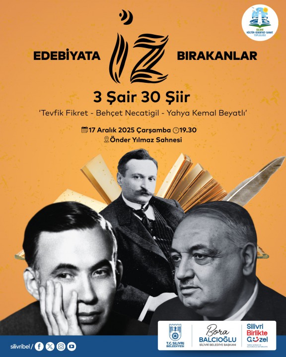 Silivri Belediyesi kültür ve sanat etkinlikleri düzenliyor. Bu bağlamda, 17 Aralık Çarşamba günü saat 19.30’da Önder Yılmaz Tiyatro Sahnesi’nde Türk edebiyatına yön vermiş üç büyük şairin seçkin eserleri edebiyatseverlerle buluşacak. Tevfik Fikret, Behçet Necatigil ve Yahya Kemal Beyatlı’nın dizeleriyle edebiyatın izinin sürüleceği etkinlik tüm vatandaşların katılımına açık olacak.