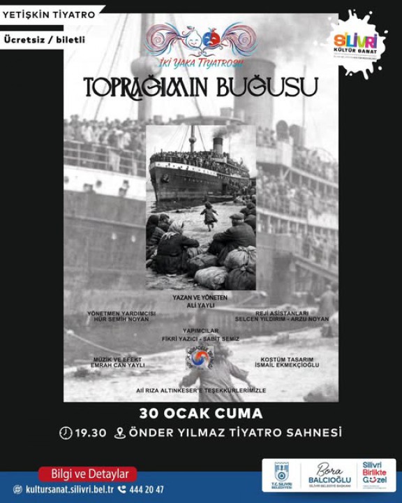 Silivri Belediyesi, vatandaşların sosyalleşebilmesi için çalışmalarına devam ediyor. 30 Ocak 2026 Cuma günü, "Toprağımın Buğusu" isimli yetişkin tiyatrosu yapılacak. Önder Yılmaz Tiyatro Sahnesi’nde saat 19.30’da gerçekleşecek etkinlik ücretsiz olarak vatandaşların katılımına açık olacak. Detaylı bilgi ve bilet için, Kültür Merkezi’ne ulaşılabilecek.